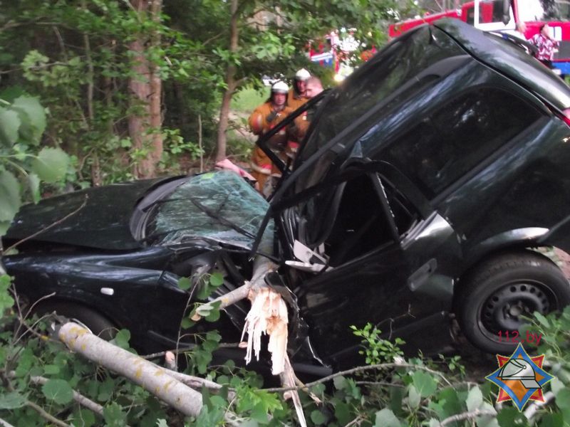 Спасатели-пожарные распилили дерево и при помощи гидравлического инструмента деблокировали находящегося в автомобиле пассажира. С диагнозом «перелом позвоночника» он был госпитализирован в реанимационное отделение.